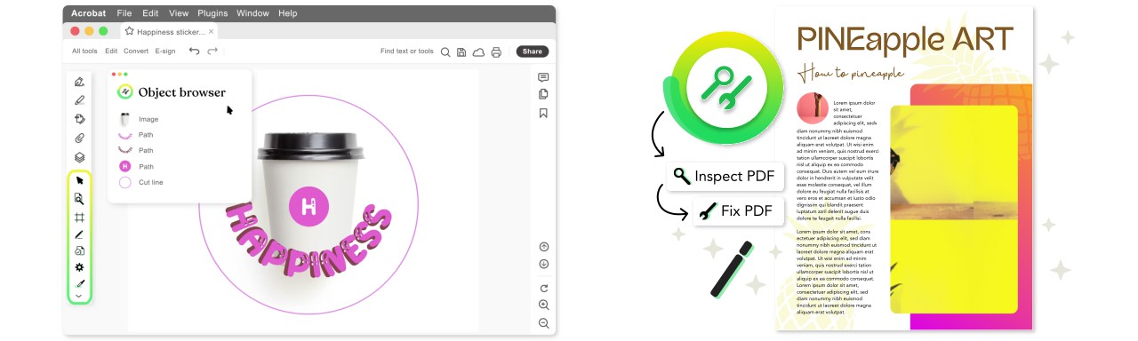 - Perbaikan cepat tanpa merusak file: mengedit secara native sehingga hal penting untuk cetak (font embed, color space, metadata, transparansi) tetap terjaga.