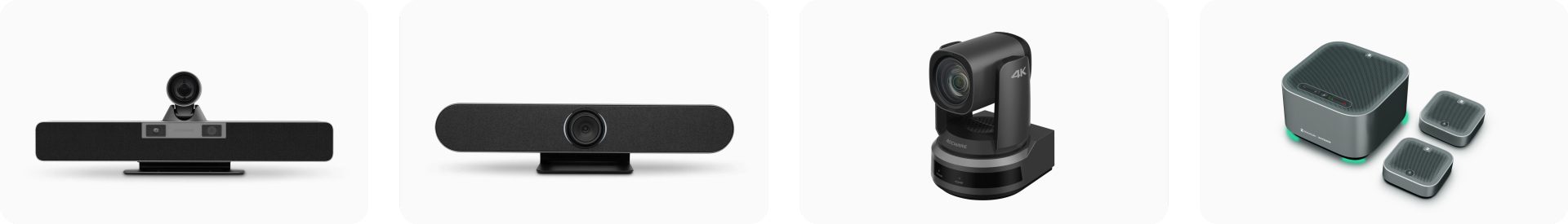 Kategori audio mencakup mikrofon array, speakerphone, speaker, serta audio processor untuk memperluas cakupan tangkapan suara dan kualitas audio ruang rapat.